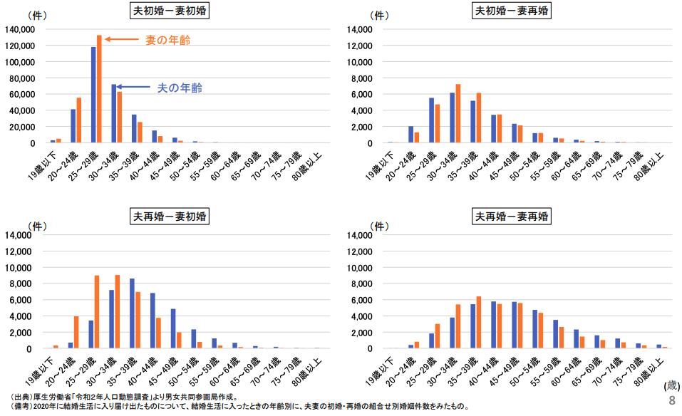 内閣府男女共同参画局が作成した2020年の婚姻データを見ると、年間20,000人以上の50代の方が結婚しているとわかりました。