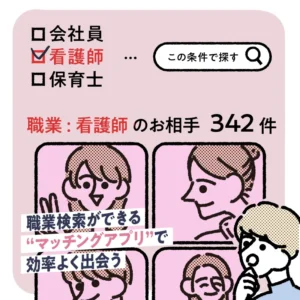 マッチングアプリでは、お相手を探す際に職業を絞れます。職業欄で「看護師」だけにチェックを入れれば、あとはプロフィール写真を見て気になる人に「いいね」を残すだけ。もっと条件を絞りたい人は、年齢や居住エリアを指定するのもいいでしょう。