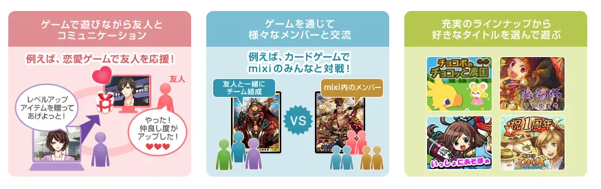 mixiゲームで一緒に遊んだ方とマイミクになったり、マイミクと時間を合わせてゲームをしたりと、同じゲーム好きの人との出会いを広げられる機能です。