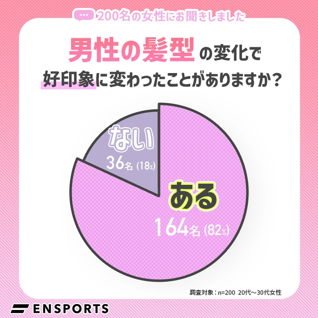 アンケート結果によると「男性の髪型の変化で好印象に変わったことがあるか?」という質問に対して、約8割の女性が「ある」と回答しています。